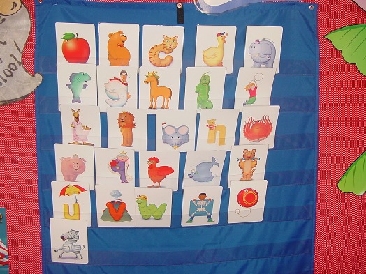 This is a picture showing the Alpha Friend cards in our pocket chart. Please ask your child the names of the animals and the sounds each letter makes.