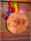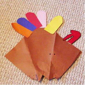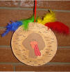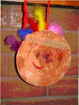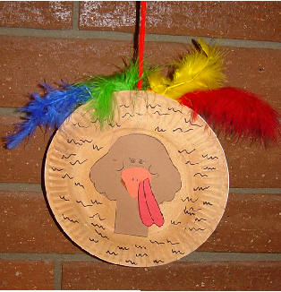 Hanging Turkey and Indian This project is really two in one. One side is the turkey and the other side is done like an Indian. We used two paper plates. A face is done with crayon for the Indian and then painted with watercolors. A construction paper headband is attached to the top. Then the turkey is painted brown. A construction paper head with wattle is attached to the center of the plate for the turkey. Feathers are glued to the back of the turkey and then the two projects are stapled together. We used a piece of yarn to hang. This project takes at least two days to make. We painted both paper plates one day. I think we made the turkey one day and the Indian on another day.