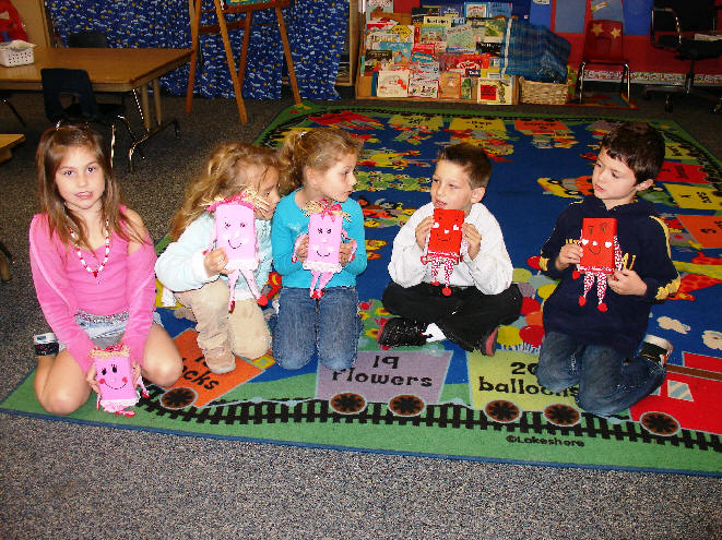 The children used the white acrylic paint to paint the block. When dry, we had each child use the paint markers to paint the eyes and mouth. The embroidery floss was used for whiskers. The pink heart shaped button was attached on top of the floss with white glue.
